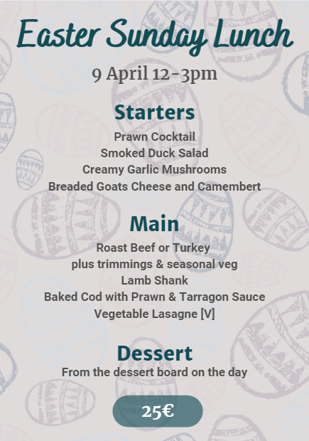 We have a delicious set menu for Easter Sunday Lunch, 12pm-3pm. Booking is essential. To reserve your table please call 05 45 29 05 07 or you can message us via our Facebook Page or book online via our booking link