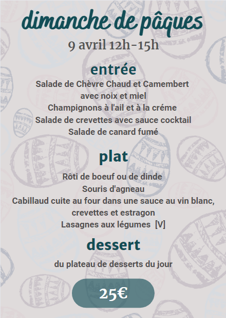 Nous proposons un délicieux menu fixe pour le déjeuner du dimanche de Pâques, de 12 heures à 15 heures. La réservation est essentielle. Pour réserver votre table, appelez le 05 45 29 05 07, envoyez-nous un message via notre page Facebook ou réservez en ligne via notre lien de réservation.